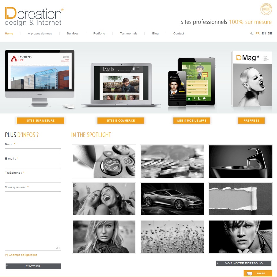 Je vous invite à découvrir dès aujourd'hui notre tout nouveau site web ! Visitez www.idcreation.be et faites-moi part de vos commentaires (si vous en avez) ! Un aperçu de nos différents services, pour ceux qui ne les connaissaient pas encore : création de site internet, création de site e-commerce, développement d'intranet et d'extranet, développement d'applications mobiles et de sites mobiles et depuis peu, tout ce qui se rapproche au prepress ! Alors, si vous recherchez un partenaire pour le développement de votre identité graphique, n'hésitez surtout pas à nous contacter pour un devis sans engagement. A très bientôt ! JulienVan Damme