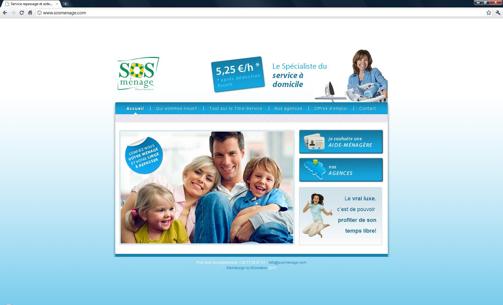 Monsieur Roca, de la société SOS Ménage, a souhaité communiquer avec une image plus dynamique en renouvellant l'image de son site web. Il a la possibilité, grâce au CMS développé par IDcreation, de modifier quand il le souhaite son site internet et ce, sur chaque page de son site internet ! IDcreation s'est occupé de A à Z de la création personnalisée de son site internet. Grâce à une nouvelle image, les internautes qui ont besoin des services offerts par SOS Ménage, trouveront toute l'information nécessaire sur le site web. Aussi bien pour les clients que pour les personnes qui souhaitent solliciter. Grâce à une programmation bien ficelée, toutes les demandes seront centralisées et dispatchées vers l'agence correspondante. Visitez le site internet www.sosmenage.com
