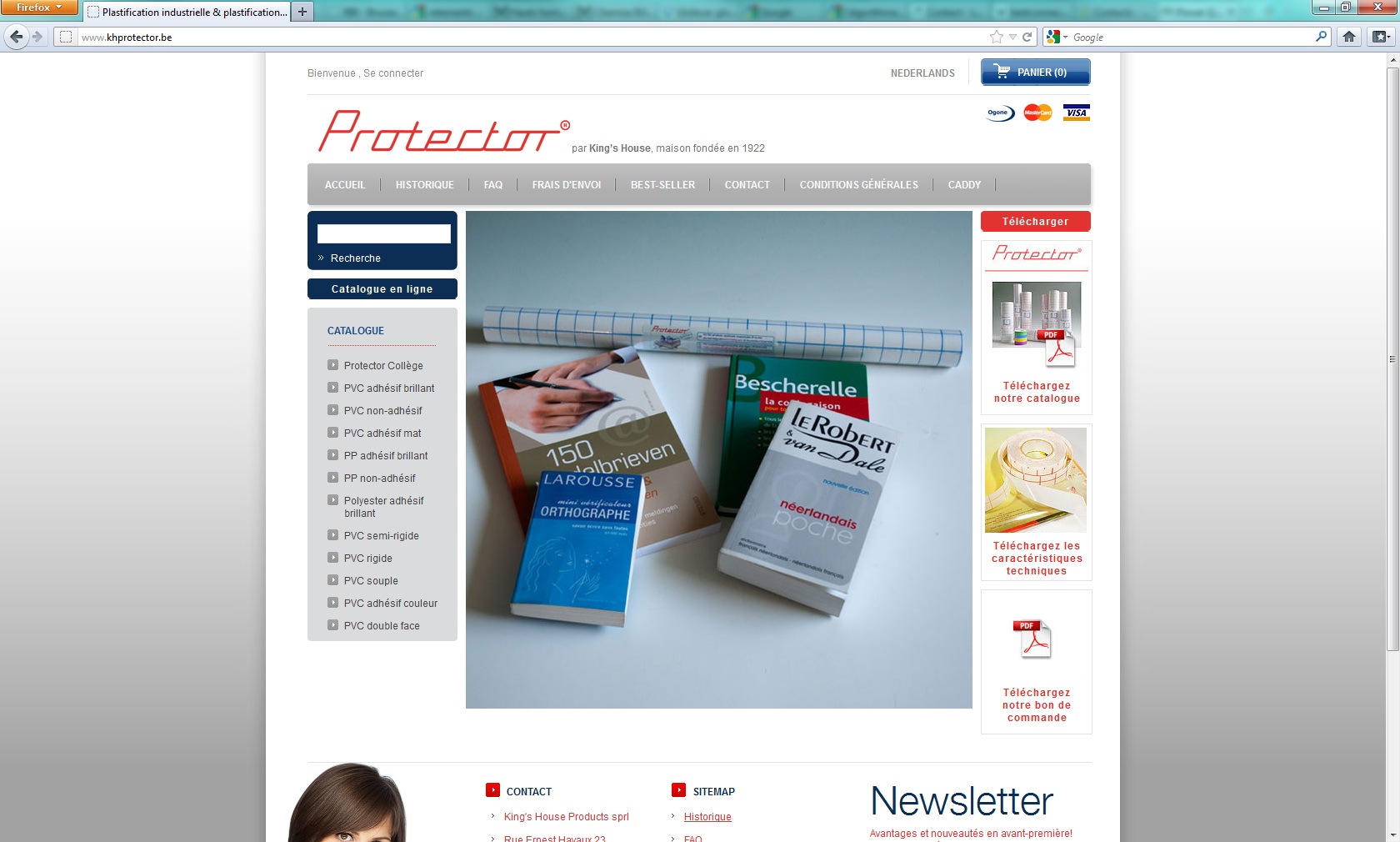 King's House Products, société spécialisée dans la fabrication des différents supports autocollants (PVC adhésif brillant, mat, PVC rigide, PVC souple, ...), s'adresse à toutes les bibliothèques, les librairies mais aussi aux étudiants. Ils ont confié la réalisation de leur site e-commerce à IDcreation, site avec paiement en ligne sécurisé par Ogone, afin que toutes les transactions soient sécurisées. Ils offrent ainsi la possibilité à tout le monde de pouvoir payer leur commande en ligne et ainsi s'assurer du bon suivi de la livraison. Pour de plus amples infos : www.khprotector.be