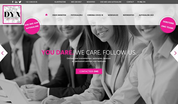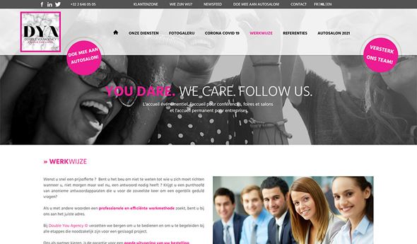 Double You Agency heeft een fris imago, dat in het webdesign tot uiting komt door het gebruik van flashy roze vlakken en accenten.