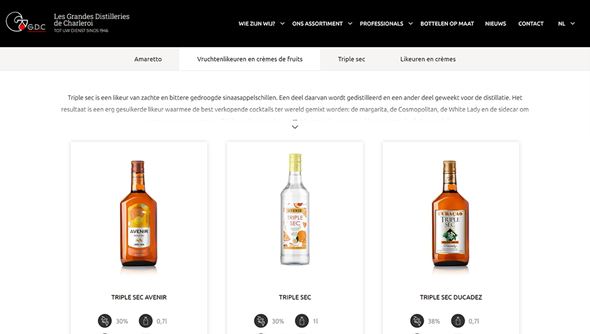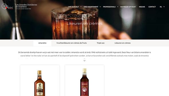 De stijlvolle uitgewerkte website van Les Grandes Distilleries de Charleroi geeft een aantrekkelijk overzicht weer van alle dranken die er worden gedistilleerd.