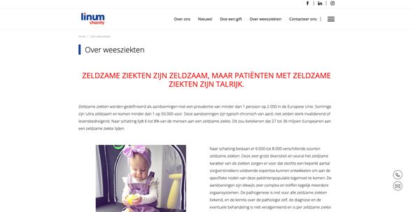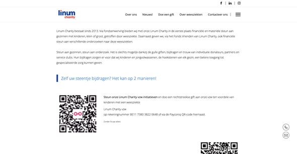 Dankzij de vernieuwde website van Linum Charity ervaren bezoekers nu een heldere en overzichtelijke online omgeving. De duidelijke navigatie maakt het gemakkelijk om snel de gewenste informatie te vinden. Bovendien kunnen de pagina's vrij worden ingevuld en bijgewerkt door Linum Charity via het gebruiksvriendelijke CMS, waardoor de site altijd up-to-date is met de laatste informatie.