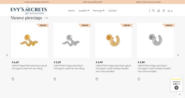 Get accessorized met Evy’s Secrets! De webshop van Evy’s Secrets biedt wekelijks een nieuw assortiment aan juwelen aan. Naast het ruime aanbod armanden en oorringen kan u er ook terecht voor allerlei piercings.